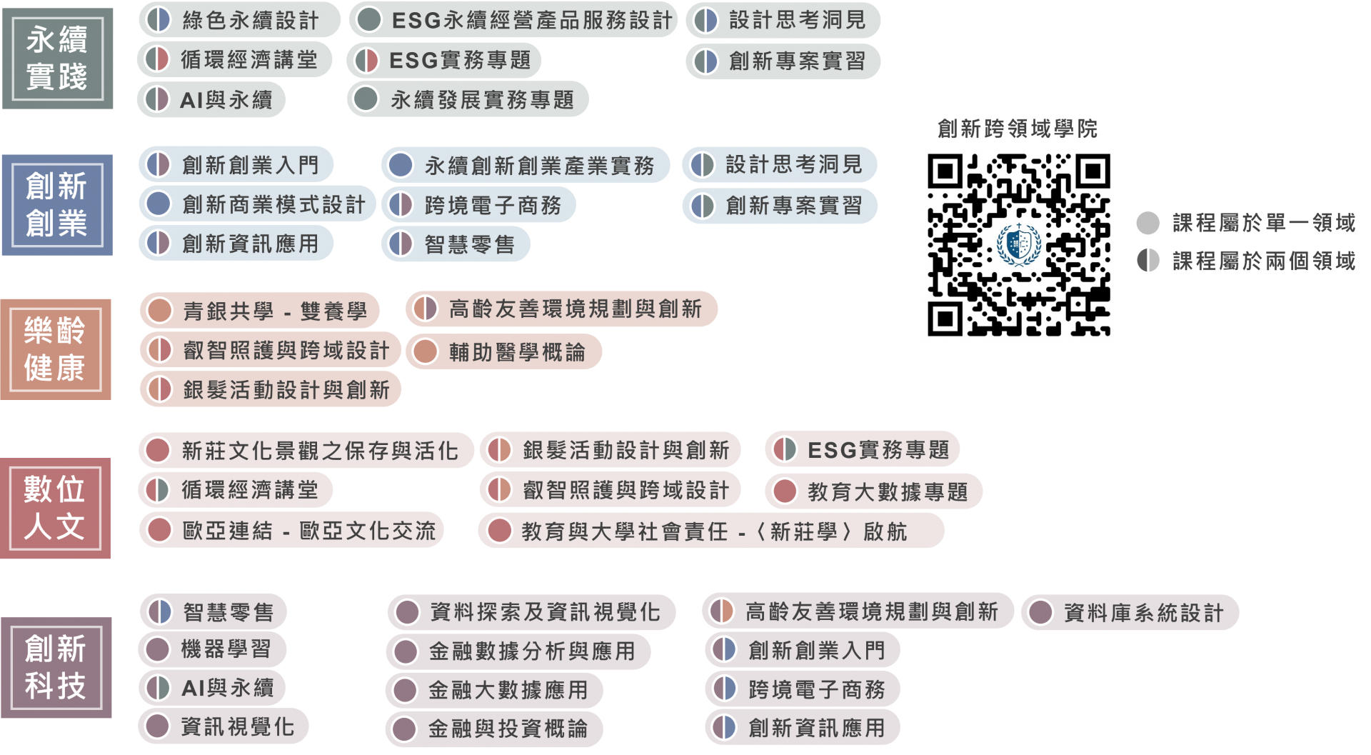 本校跨領域學院課程,分為五大領域:創新科技、創新創業、數位人文、永續實踐及樂齡健康