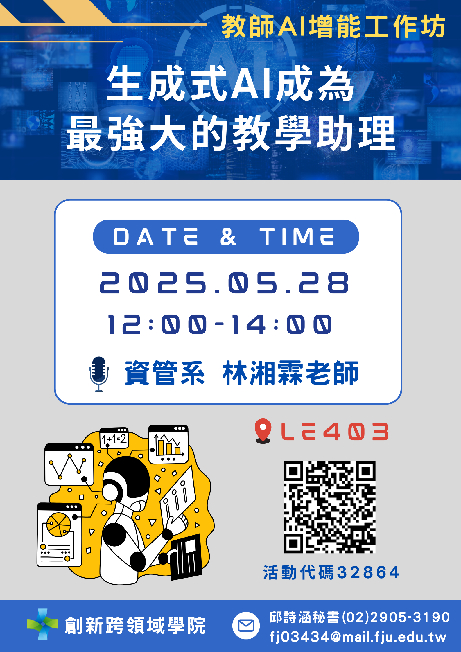🥳也歡迎與時代一起進步的教學助理TA報名,請您來電或寫信給承辦人(fj03434@mail.fju.edu.tw),留下您的學號,幫您手動加入喔!