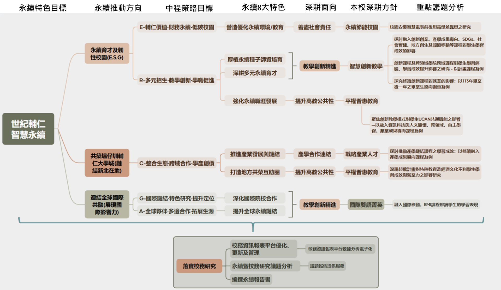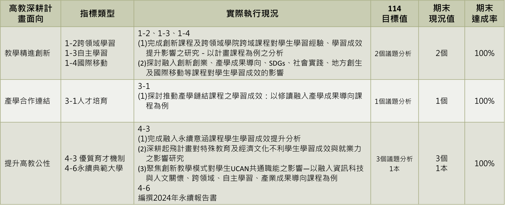 永續發展暨校務研究中心從G.R.A.C.E中程校務發展重點計畫進行重點成效的檢視,並對應高教深耕計畫面向、本校深耕方針、重點策略與SDGs,114年計畫執行成果分述如下: