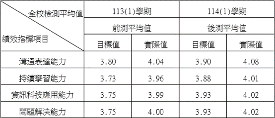 -透過多元宣導與獎勵機制,鼓勵學生參與UCAN共通職能檢測,並配合註冊期間辦理全校施測。另針對檢測率偏低之班級,辦理入班施測以強化整體覆蓋率。經資料彙整並剔除無效樣本後,114(1)學年度共計回收8,589份有效檢測資料,各項共通職能構面之實際測評結果,皆達深耕計畫主冊所訂全校平均目標值,完成本年度UCAN檢測推動與資料蒐集作業。
