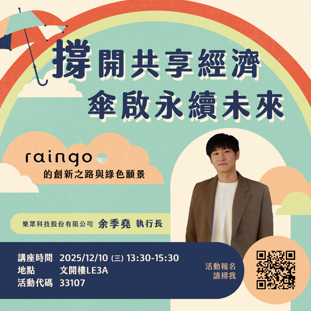 -永續生活是人類必須積極發展的目標,活動邀請進駐臺北捷運之樂眾科技股份有限公司余季堯執行長,分享其創業歷程與企業草創階段之規劃經驗。講座內容聚焦於共享經濟於物聯網時代之發展趨勢,說明如何將創新服務導入大眾市場,並探討永續經濟於實務運作與未來發展之可能性。