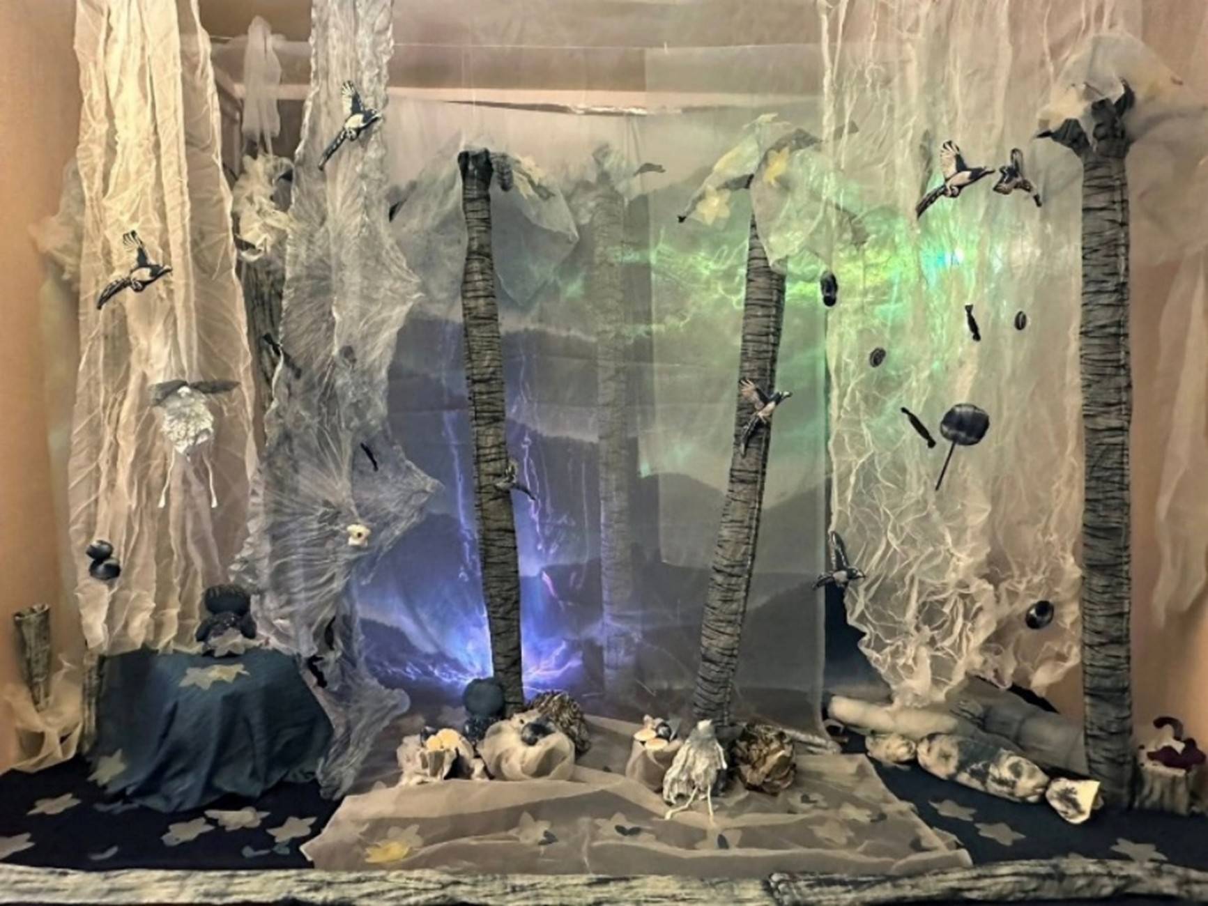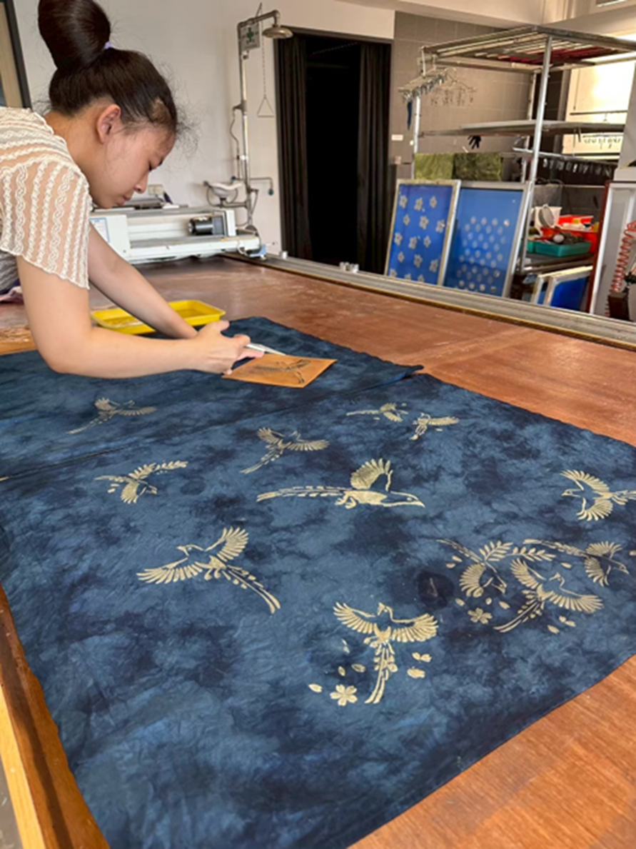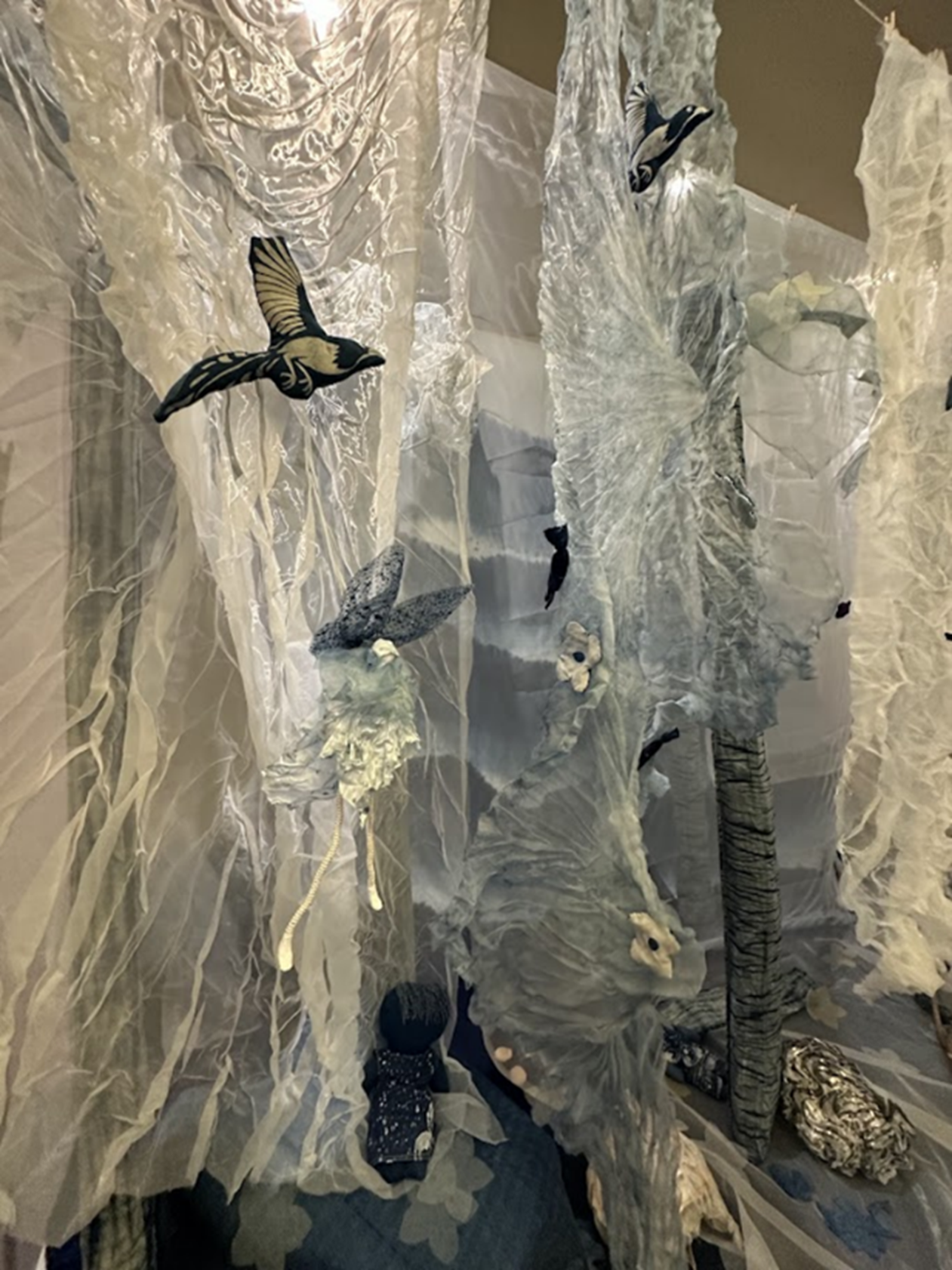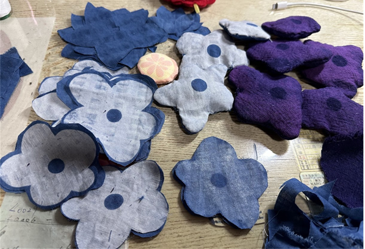 作品以「小精靈與她的糖果森林」為題,由王淑宜老師帶領學生結合課程染色技法、AI 圖像生成與敘事設計,打造出活潑而富想像力的藍染場景。以絞染製作的高低樹木形塑森林層次;絹印邊布在燈光投射下形成空間錯視;型染藍鵲展現飛行動態;小精靈與藍寶寶以剩布再製;回收紙布與試驗布料化作糖果;薑黃、藍染、紫膠染出的三色花瓣點綴其間。作品以永續材料、跨域技法與童趣敘事為核心,展現輔大在藍染創作上的獨特想像力。