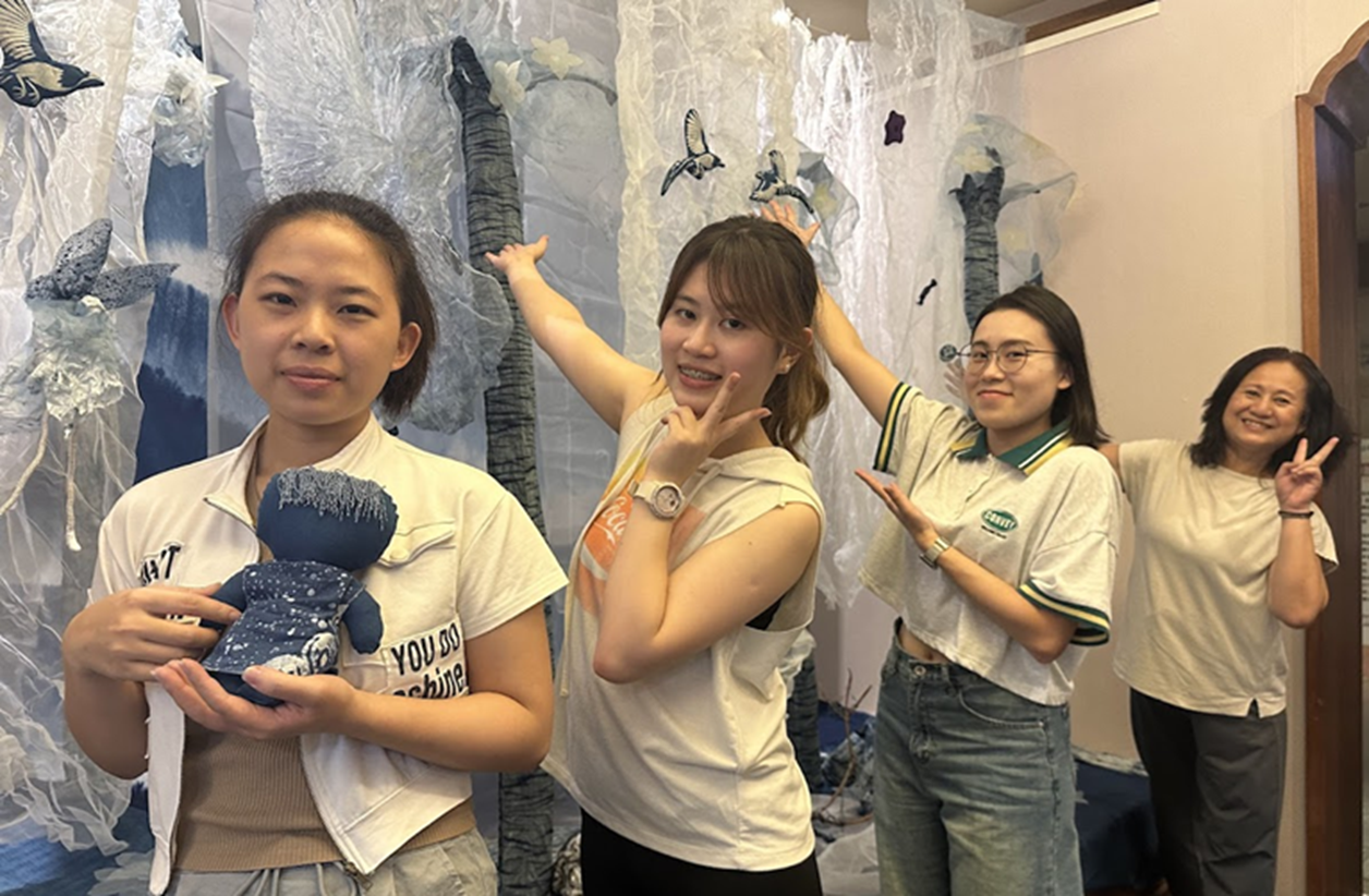 輔仁大學織品服裝學系與三峽染工坊攜手完成的共創作品於今年三峽藍染節特展亮相。創作由王淑宜老師帶領學生參與,林語柔、郭郁慈、鄒穎穎負責染布與縫製;黃靖閔、田書華設計糖果造型;簡鈺婕製作山水背景。作品以「糖果森林中的小精靈與夥伴」為主題,運用絹印邊布、大方巾剩布等廢棄材料再製,小精靈服裝亦以剩布剪裁完成,展現永續創作精神。整體呈現藍染文化的多元風貌,也突顯學生在工藝、敘事與社區協作上的創意能量。