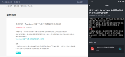 (3)114學年度起,TronClass 平台與學生請假系統串接功能正式上線,方便教師掌握點名狀況與學習追蹤。