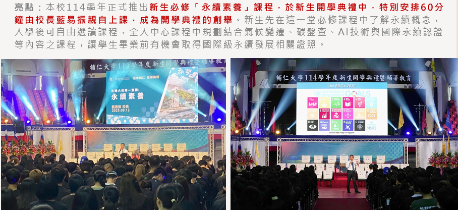 (1)114 學年度首創於新生開學典禮安排 60 分鐘由校長親自講授「永續素養」必修課。