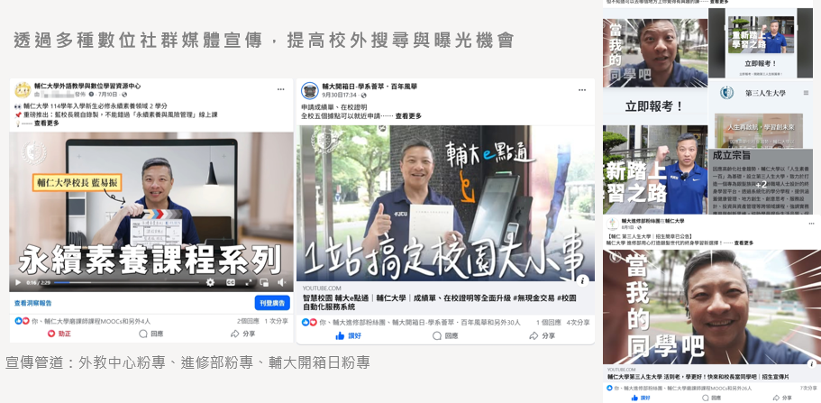 除專訪學長姐製作新生先修線上課程宣傳片外,也透過校長、教務長親自參與拍攝,製作「校園 e 點通」自動化機器、永續素養及第三人生大學等宣傳影片,並利用校內電子看板、各社群媒體(Facebook、IG等)及 App 推播,強化校內外能見度。