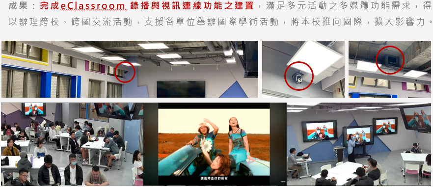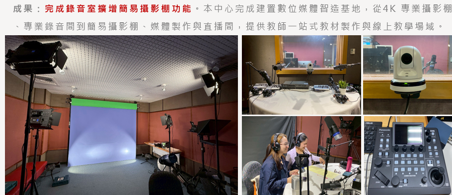 本期擴充 eClassroom 錄播與視訊連線功能,以及錄音室擴增簡易攝影棚功能,完備「數位媒體智造基地」,包含 4K 專業攝影棚、錄音間及直播間,提供教師一站式教學教材製作場域。