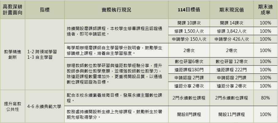 計畫在推展數位學習課程認證、跨校合作及校園品牌建設上有顯著表現。