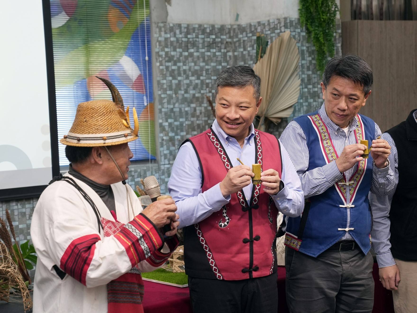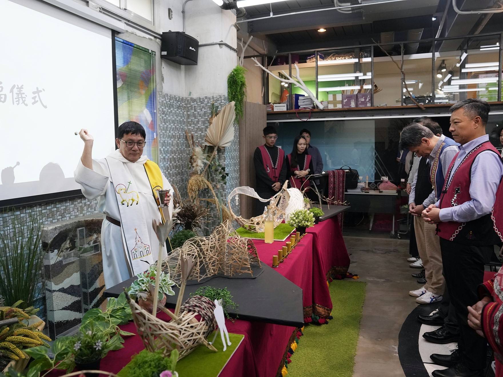 隨後由頂定牧師進行泰雅族傳統祈福禮,不僅吟唱古調亦邀請現場嘉賓一併進行點酒禮。