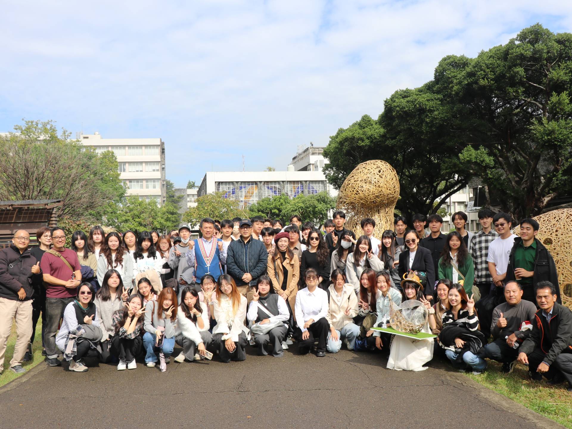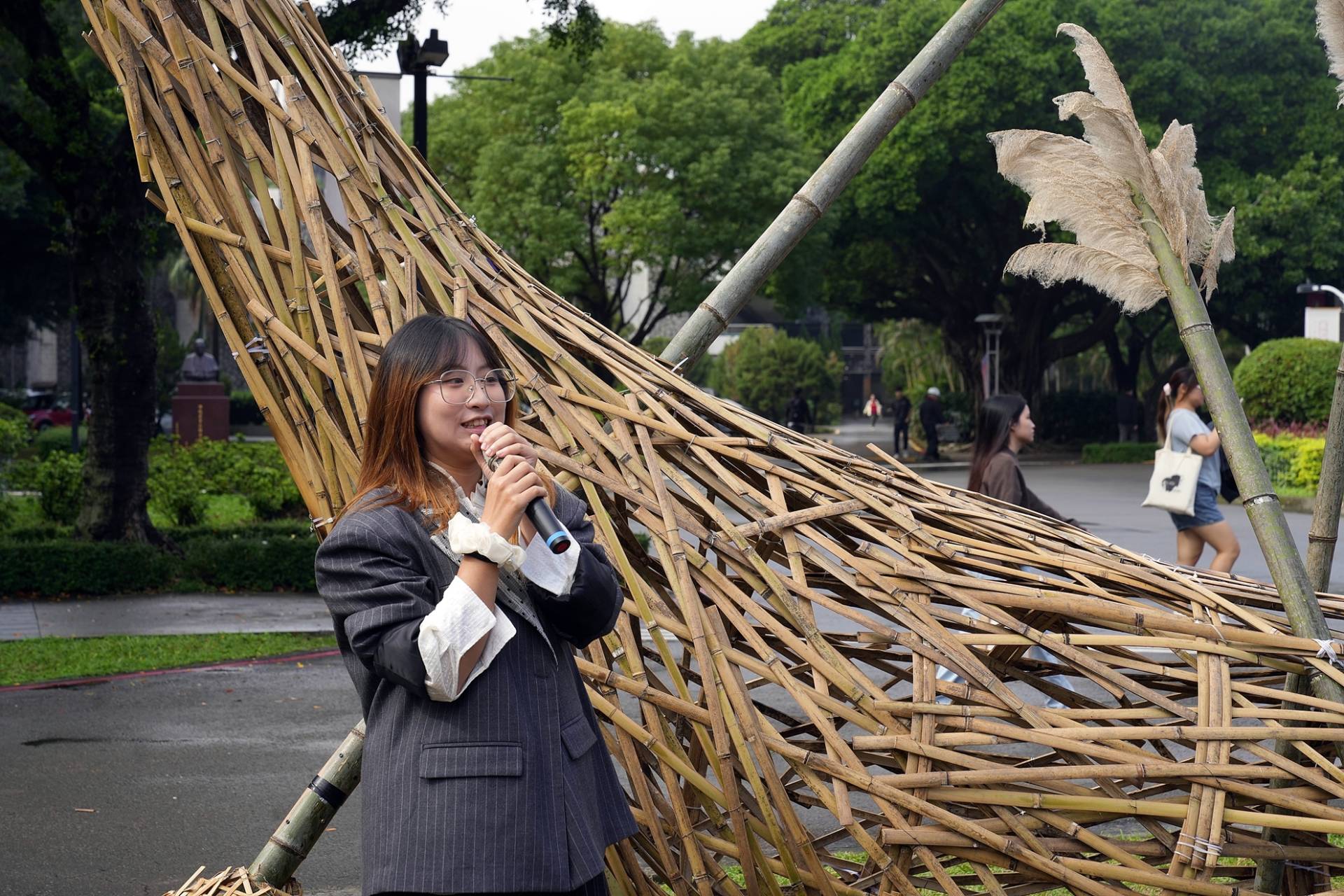 隨後眾人移步於室外進行導覽,由學生親自介紹作品及創作理念。