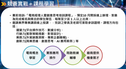 1. 舉辦全國大專院校B2B跨境電商競賽及帶領學生參與競賽。本比賽是搭配台北市進出口商業同業公會、中華國際經貿研究學會、嘉業資訊股份有限公司 與阿里巴巴國際站等,舉辦為期三個月的跨境電商競賽。由學生組隊與企業媒合後,實際操作阿里巴巴國際站平台,完成產品上架優化、內容行銷、商業企劃等任務,累積跨境電商知能及 B2B 實戰經驗。此比賽最大特色是學生將有機會親身參與 B2B 跨境電商平台操作,或針對電商場景中的實務問題提出 AI 應用解方,深化其對數位行銷、平台經營與生成式 AI 應用的理解與實踐能力,進一步培養具備數位轉型素養的電商新銳人才。
