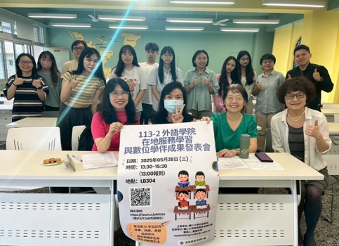 (三) 本計畫舉辦兩場「在地服務學習與數位學伴服務學習成果發表會」於 2025年5月28日與12月10日進行 : 學生發表服務心得,並邀請專業評審依「主題內容」、「創意性」、「成果展現」及「自我反思」進行評選 。包含參與「在地服務學習」、「雙語數位學伴」及「數位學伴計畫」之學生,涵蓋英文、西文、日文等學系及跨領域學程 。