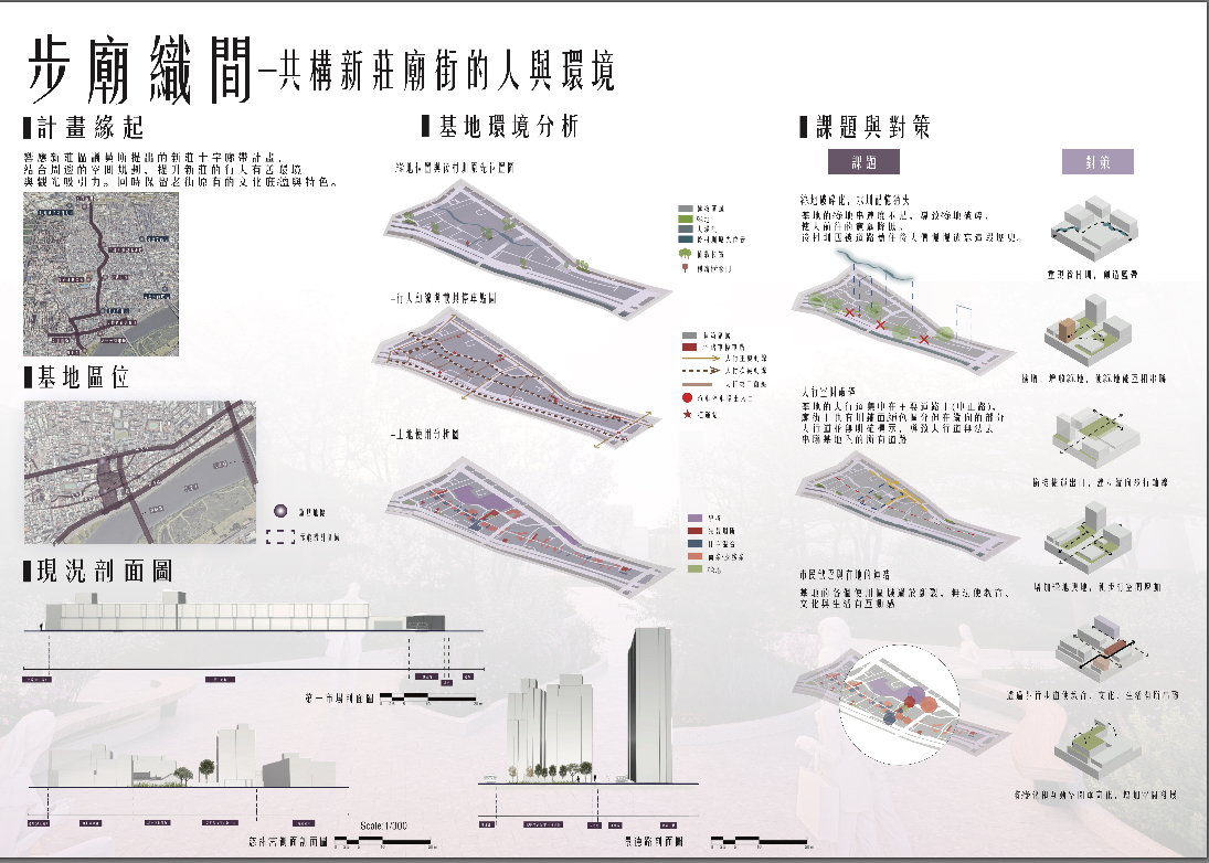 2. 設計與學習成效方面, 學生針對貴子坑溪河岸環境提出了結合都市防災、生態修復與文化價值的「韌性永續景觀」設計方案,並製作了高品質的規劃圖與物理模型。對於新莊廟街的設計,學生透過基地觀察與歷史探勘,提出了針對街區再生、文化重織及公共空間改善的設計構想。這些成果不僅落實了SDGs核心素養,也培養了學生的基地調查與分析能力、團隊合作能力、系統思考能力,並為其大四畢業設計奠定堅實的實務操作基礎。