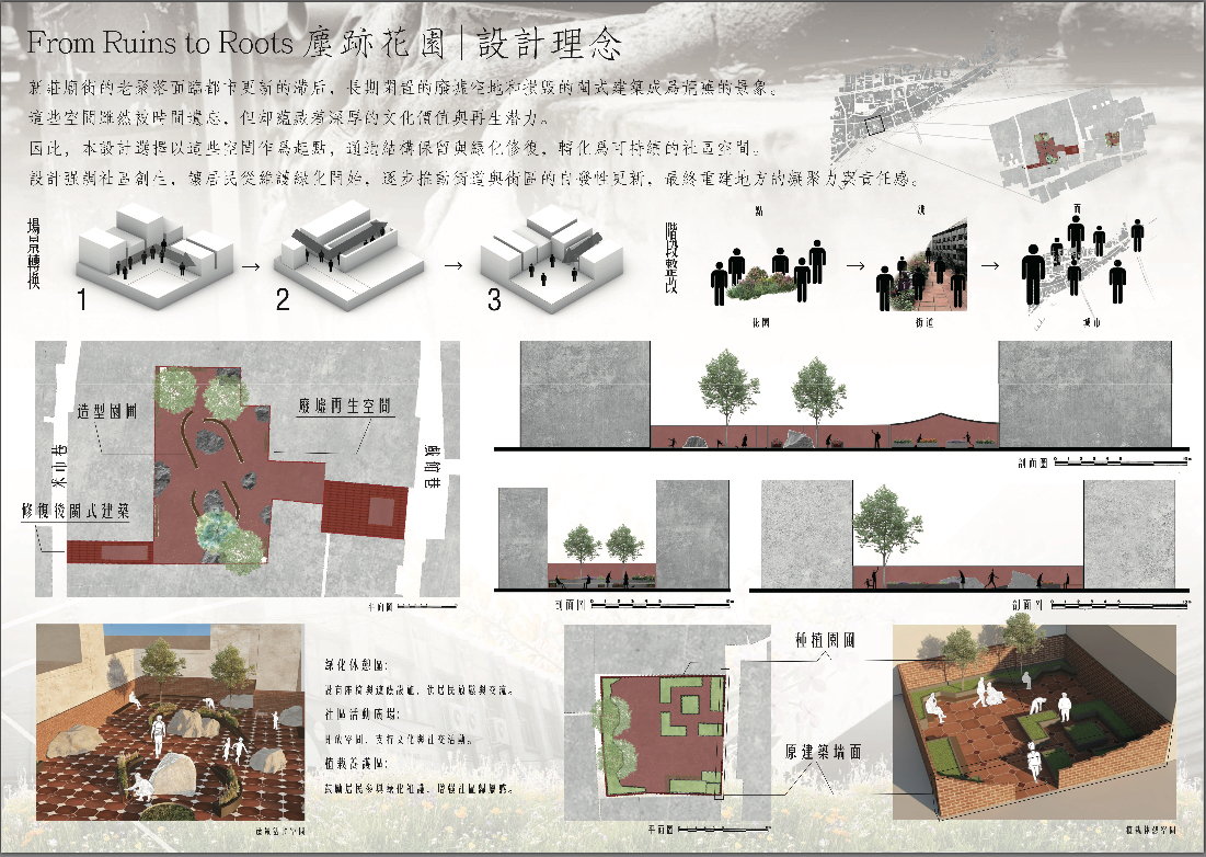 本計畫圍繞「韌性永續景觀」開展多元教學活動。內容包含由專業建築師與景觀總監主講的 6 場專題講座,例如謝國鐘建築師分享冬山河整治歷程,以及陳怡雯老師漫談新莊老街歷史。此外,安排 2 場移地教學案例參訪:實地踏查「貴子坑溪」以理解都市藍綠基盤與防災設計,並赴「八斗子」觀察海岸生態、綠色海鮮與漁村文化。課程核心為參與式設計,學生針對「新莊廟街」及「貴子坑溪」進行田野調查與基地分析,最終辦理 2 場成果發表交流會,透過評圖形式展出包含專業圖說與物理模型的設計方案。