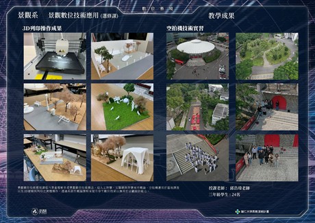 在「提升高教公共性」(4-6 永續典範大學) 方面,景觀系學生利用 3D 列印技術將設計概念轉化為實體模型,進行校園空間改造練習。此外,學院舉辦了為期一週的數位藝境《虛實.聲境.未來輔仁》成果發表及展覽,公開展示了虛實融合、聲境互動的跨域學習成果。