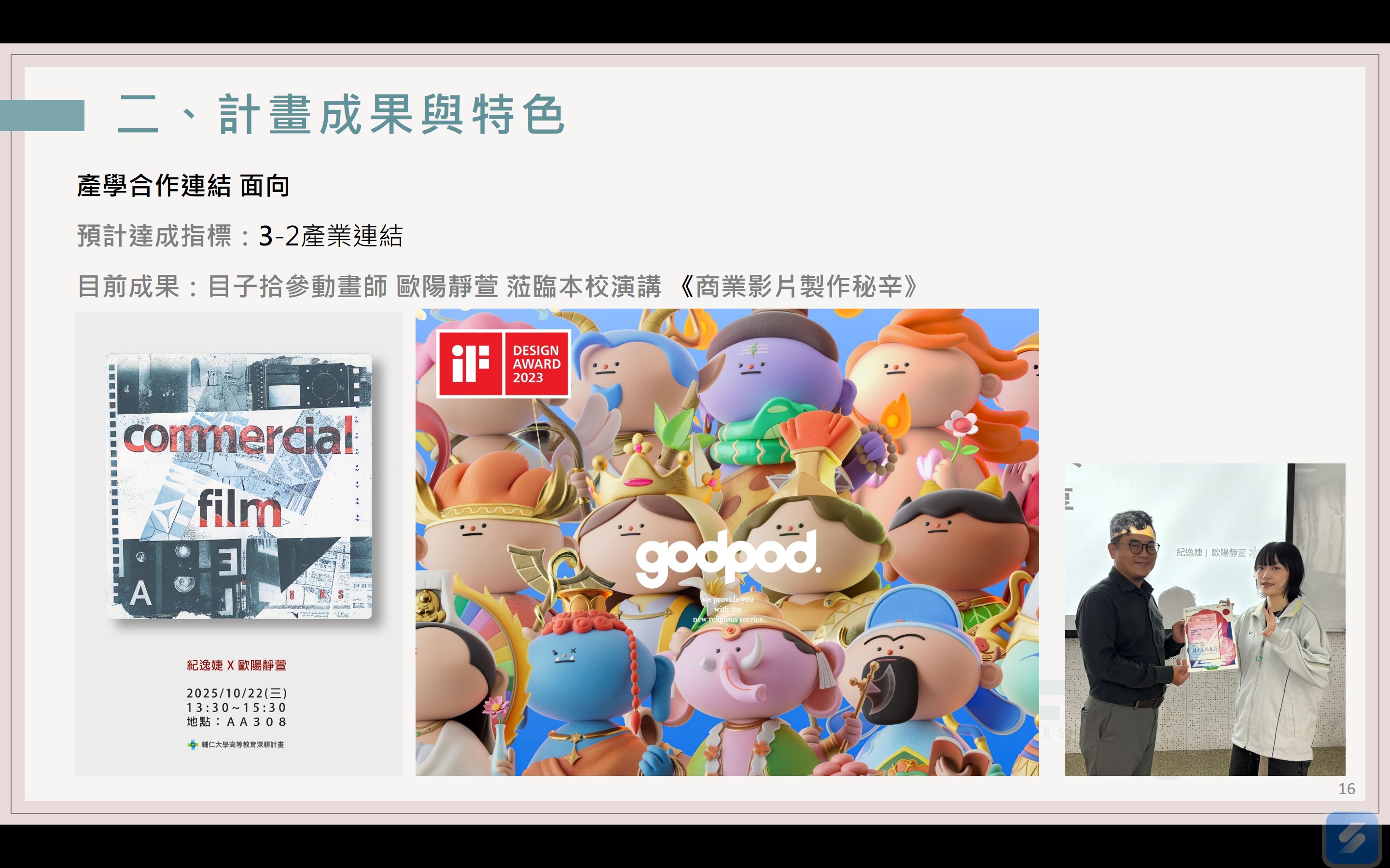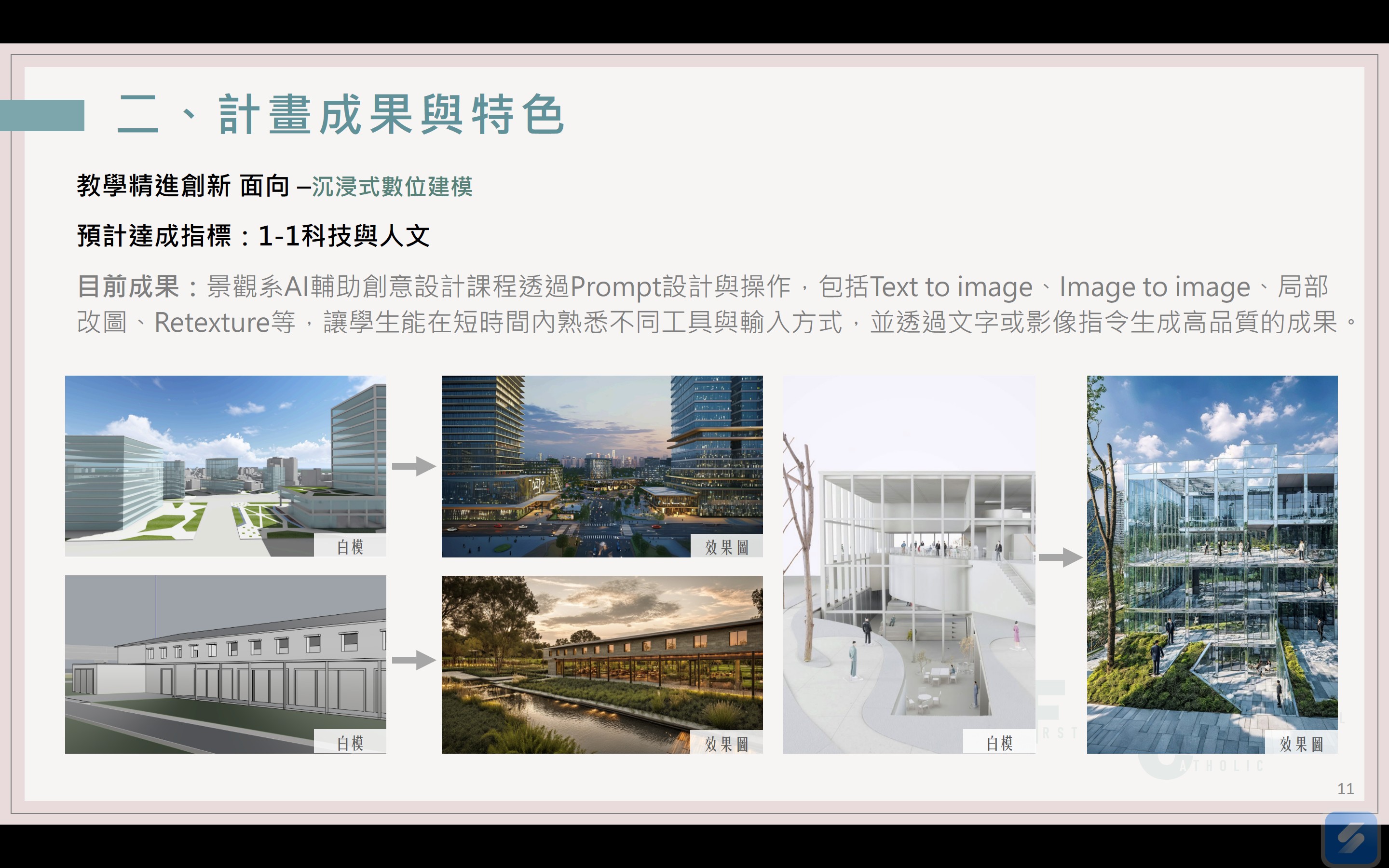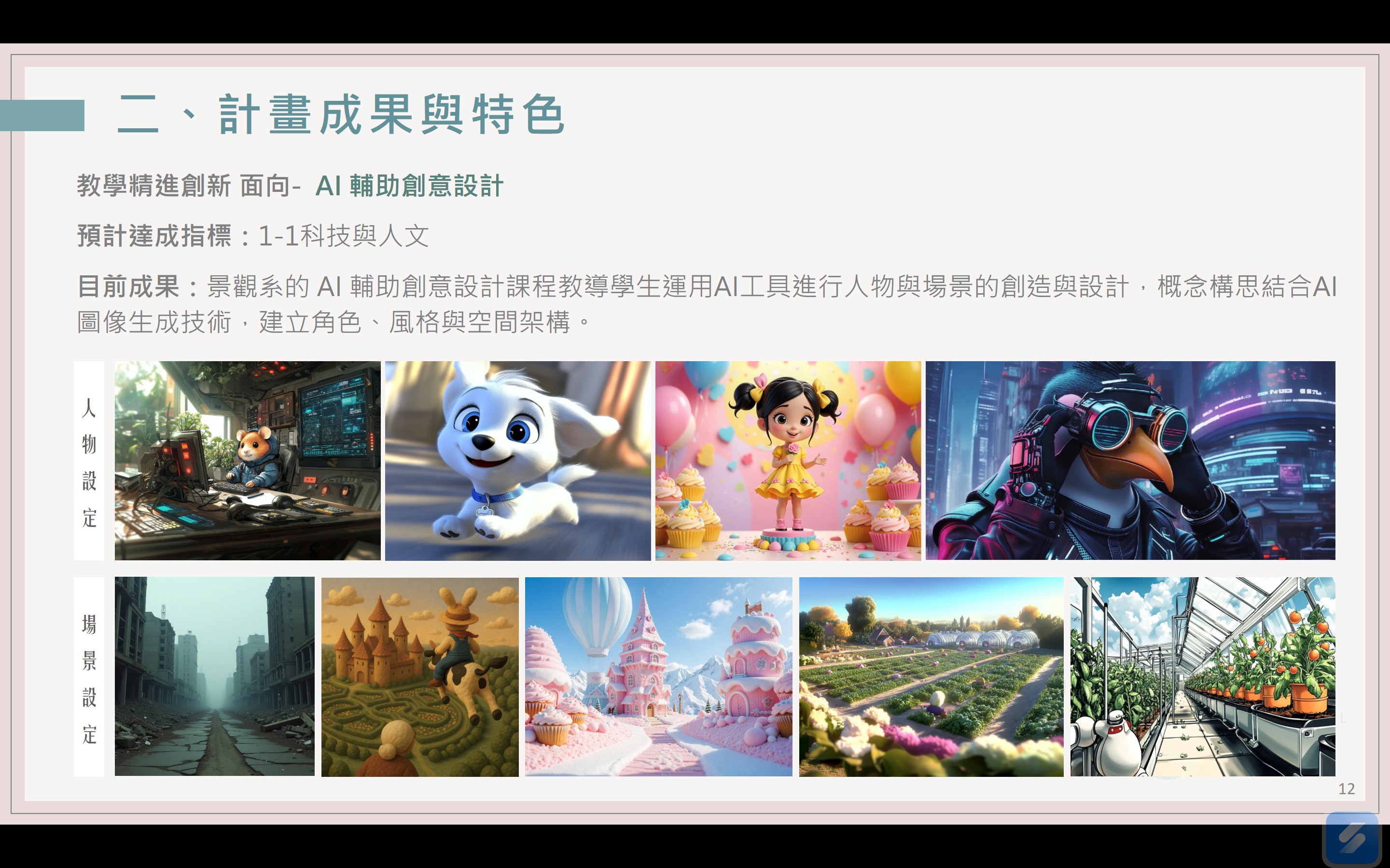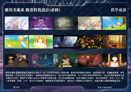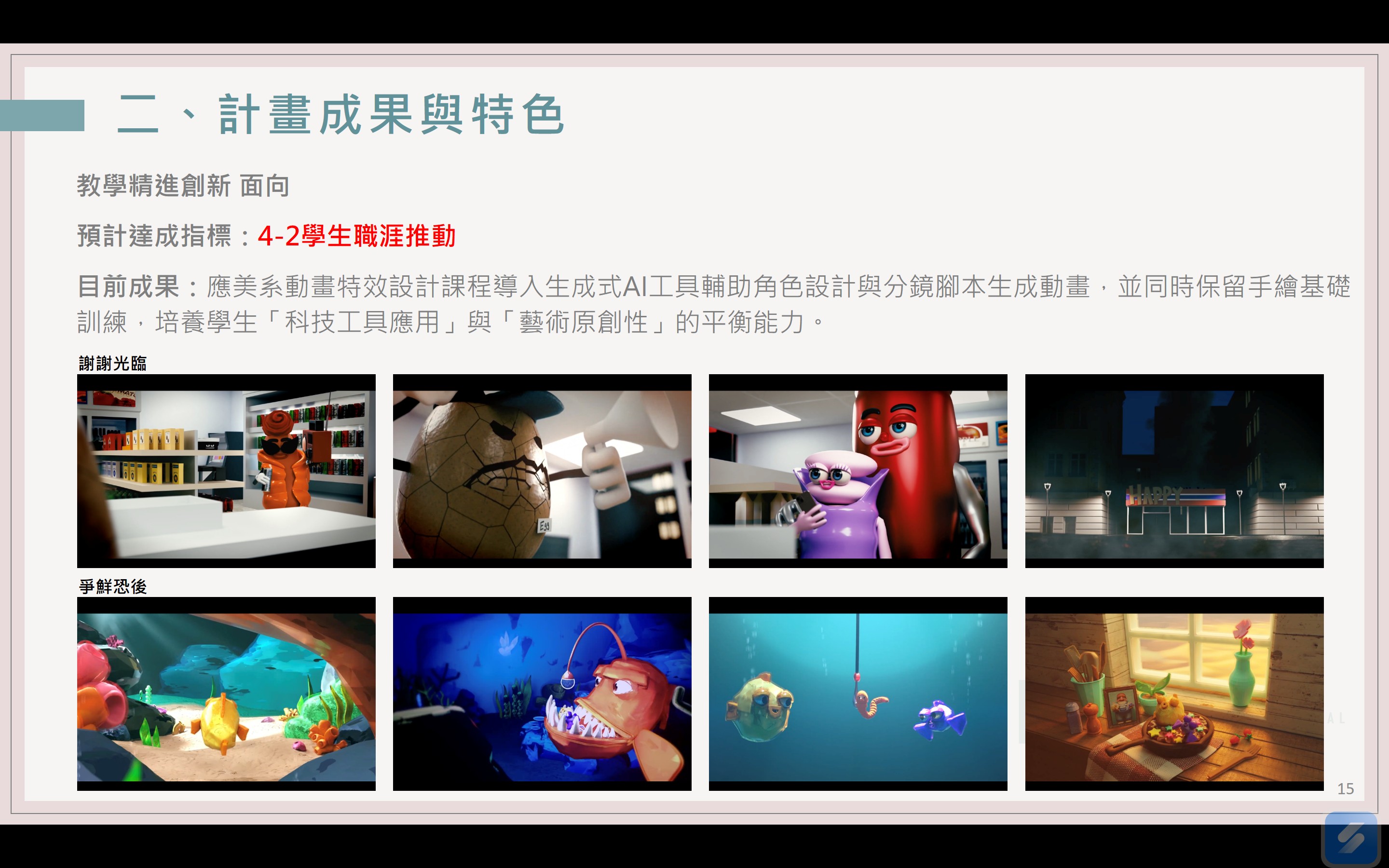 - 紮實的實作訓練:景觀系提供空拍機操作、Luma 3D建模、3D列印實機操作等訓練;應美系舉辦了「夢想動畫 3D AI 動畫工作坊」;音樂系則產出了 16 首 AI 應用樂曲及 7 首原創電影配樂作品.