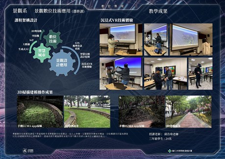 - 跨領域學習 (1-2):景觀系、應美系、音樂系課程教師組成了跨域師資群。舉辦了多場跨領域活動,包括應美系與音樂系合作的動畫配樂講座、以及景觀系與老師合作講解 VR 技術應用於景觀設計。音樂系電影音樂管弦樂法課程,結合配樂與 AI,為傳統管弦樂創作提供新的方式。