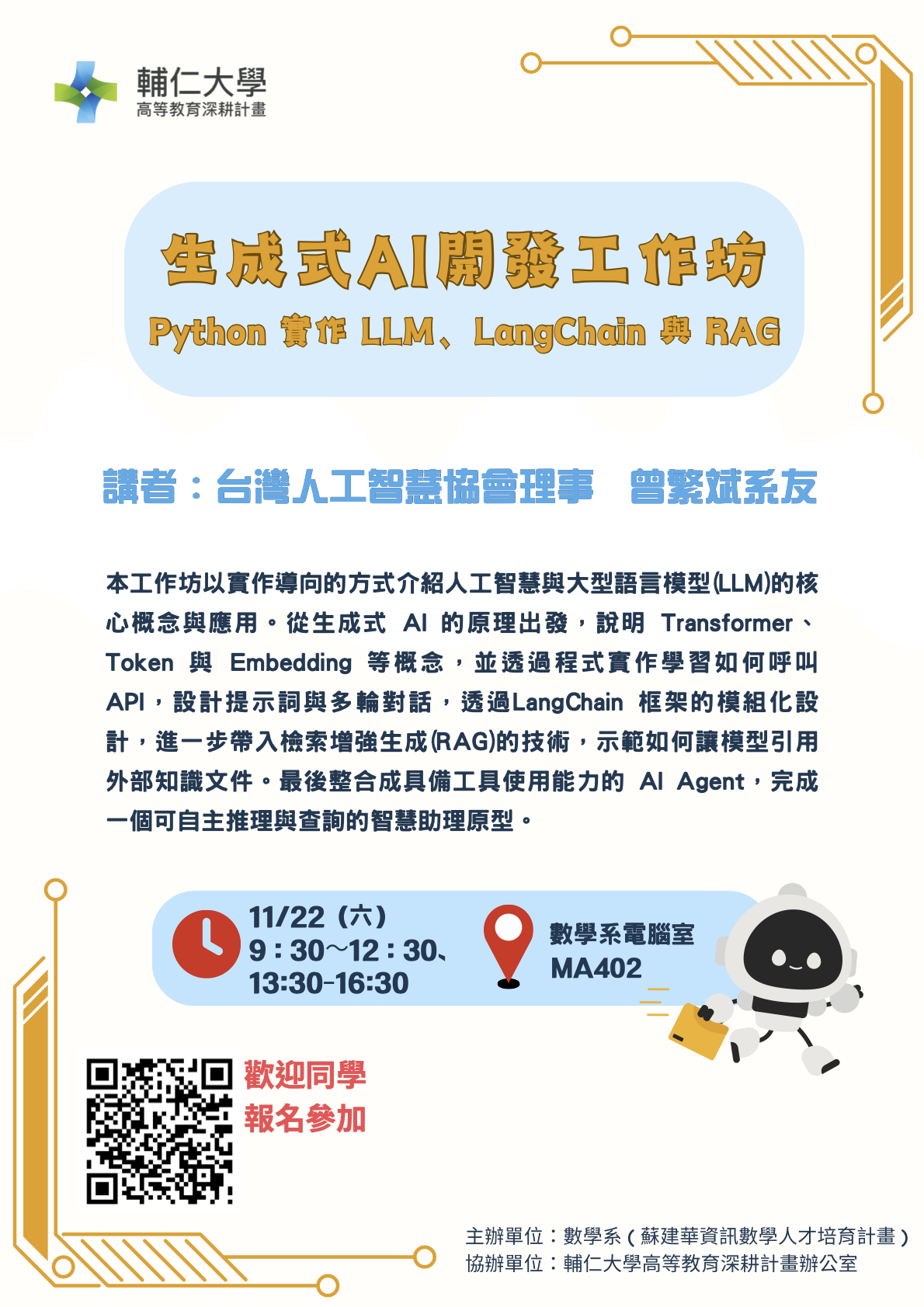 - 生成式 AI 系統化導入課程:於核心專業課程中導入大型語言模型與應用平台,讓學生實際完成 AI 應用專題。
