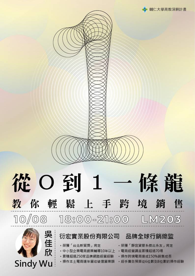 本次網路行銷課程演講主題為「從0到1一條龍:教你輕鬆上手跨境銷售」,由輔大高教深耕計畫支持,衍宏實業品牌全球行銷總監吳佳欣主講。
